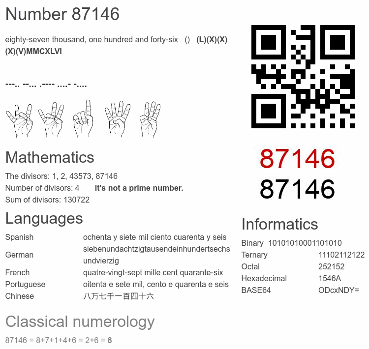 If you know something interesting about the number 87146 or any natural number (positive integer), please write to us.What is 87,146 in other units