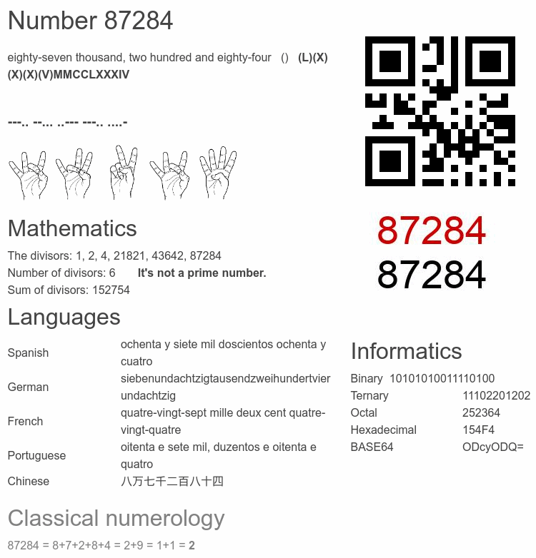 The even number 87,284 is spelled 🔊, and written in words: eighty-seven thousand, two hundred and eighty-four. The ordinal number 87284th is said 🔊 and written as: eighty-seven thousand, two hundred and eighty-fourth. The meaning of the number 87284 in Maths: Is it Prime? Factorization and prime factors tree. The square root and cube root of 87284. What is 87284 in computer science, numerology, codes and images, writing and naming in other languages. Other interesting facts related to 87284.