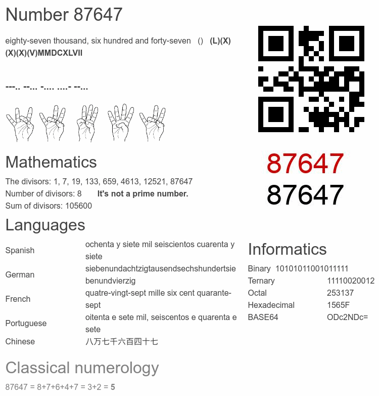 | Portuguese: | 🔊 (número 87 647) | oitenta e sete mil, seiscentos e quarenta e sete |