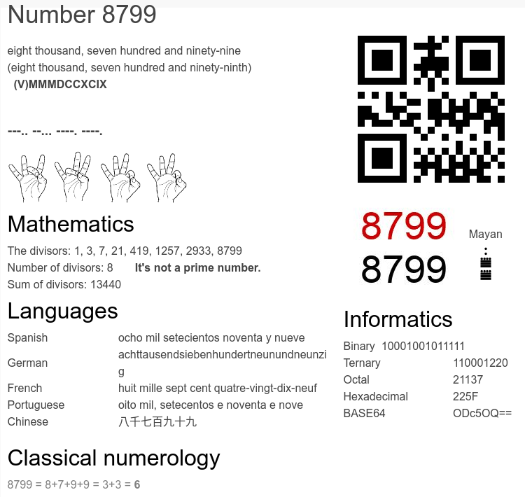 | Spanish: | 🔊 (número 8.799) | ocho mil setecientos noventa y nueve |
