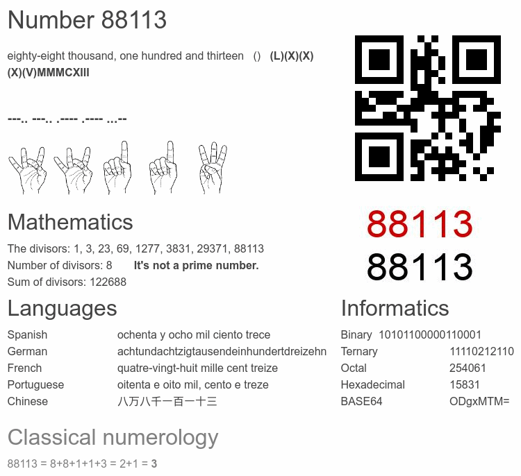 | Spanish: | 🔊 (número 88.113) | ochenta y ocho mil ciento trece |