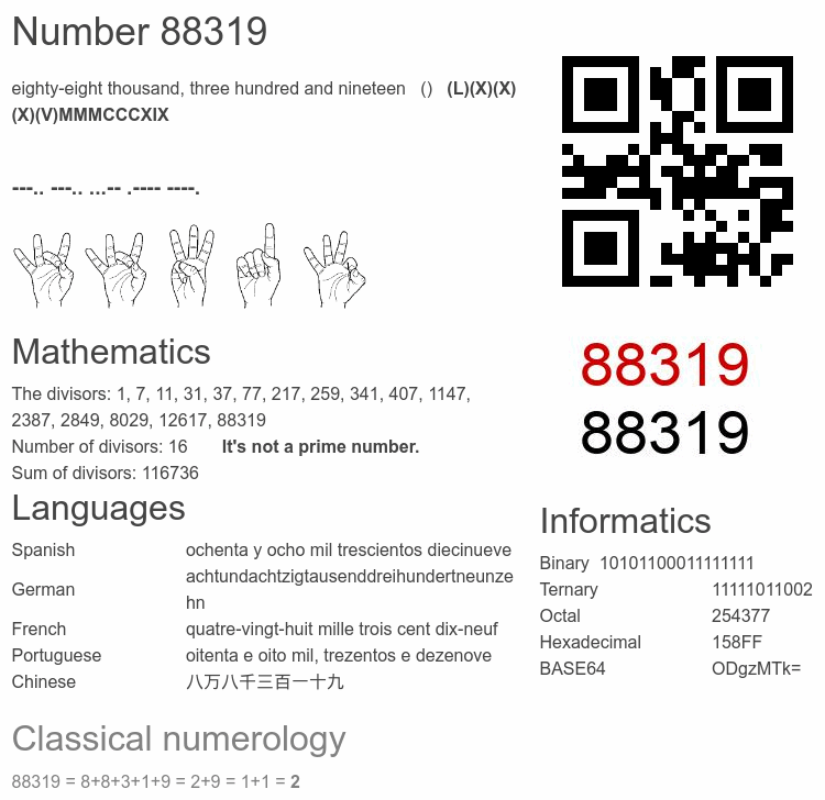 | Chinese: | 🔊 (数 88 319) | 八万八千三百一十九 |