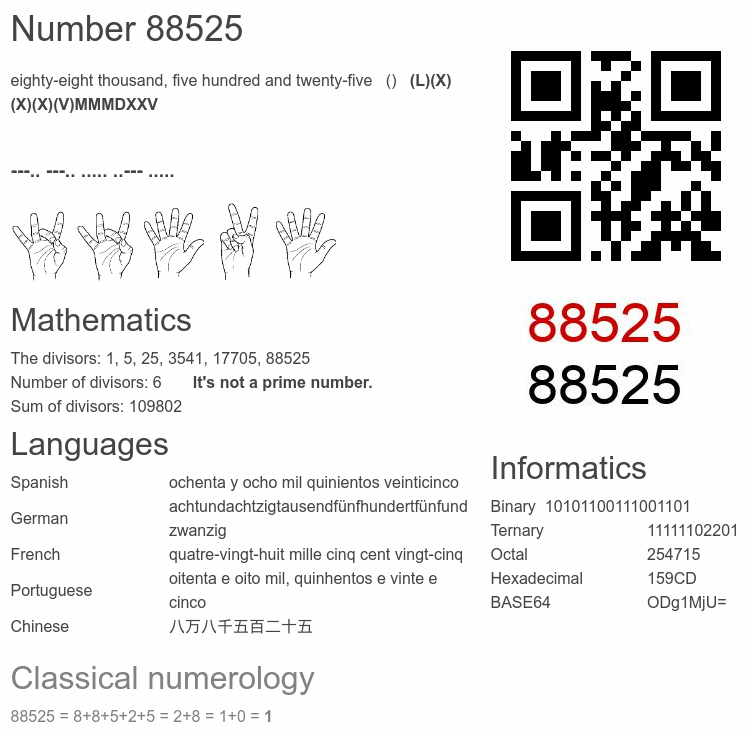 | Arabian: | 🔊 (عدد 88,525) | ثمانية و ثمانون ألفاً و خمسمائة و خمسة و عشرون |