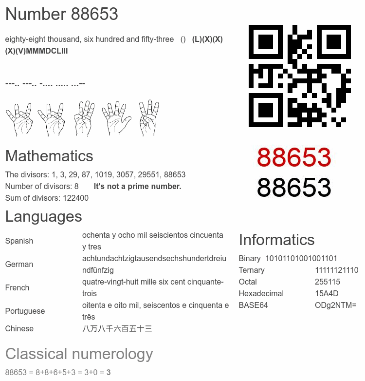 | Chinese: | 🔊 (数 88 653) | 八万八千六百五十三 |
