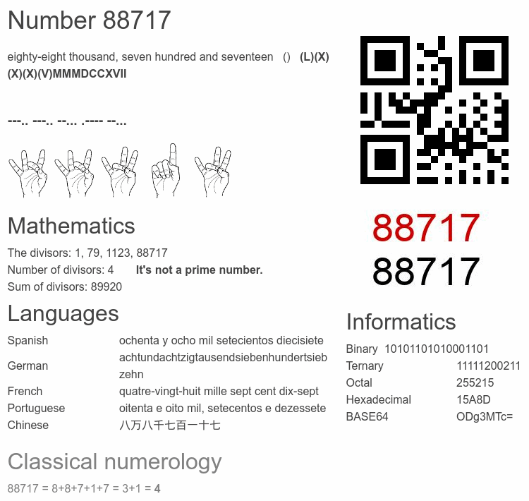 | French: | 🔊 (nombre 88 717) | quatre-vingt-huit mille sept cent dix-sept |