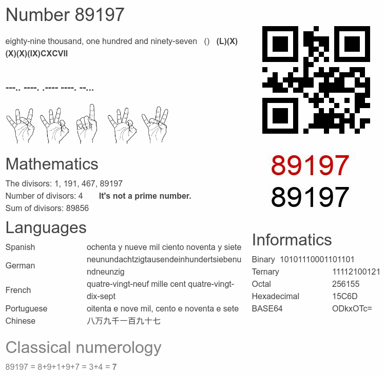 The odd number 89,197 is spelled 🔊, and written in words: eighty-nine thousand, one hundred and ninety-seven. The ordinal number 89197th is said 🔊 and written as: eighty-nine thousand, one hundred and ninety-seventh. The meaning of the number 89197 in Maths: Is it Prime? Factorization and prime factors tree. The square root and cube root of 89197. What is 89197 in computer science, numerology, codes and images, writing and naming in other languages. Other interesting facts related to 89197.