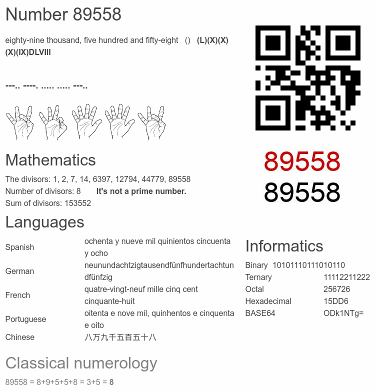 | Chinese: | 🔊 (数 89 558) | 八万九千五百五十八 |