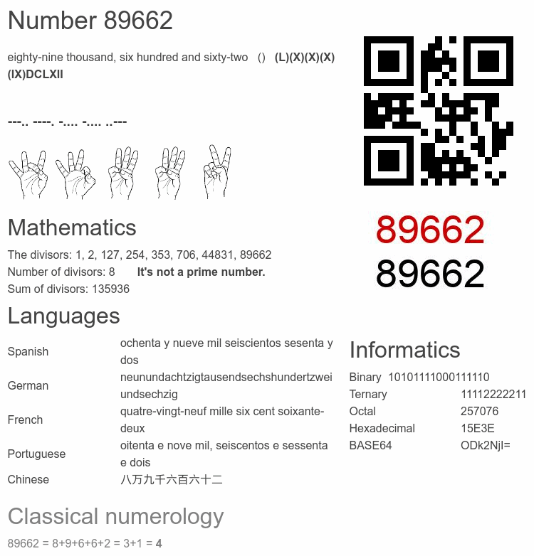 If you know something interesting about the number 89662 or any natural number (positive integer), please write to us.What is 89,662 in other units