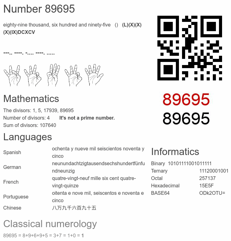 | Chinese: | 🔊 (数 89 695) | 八万九千六百九十五 |