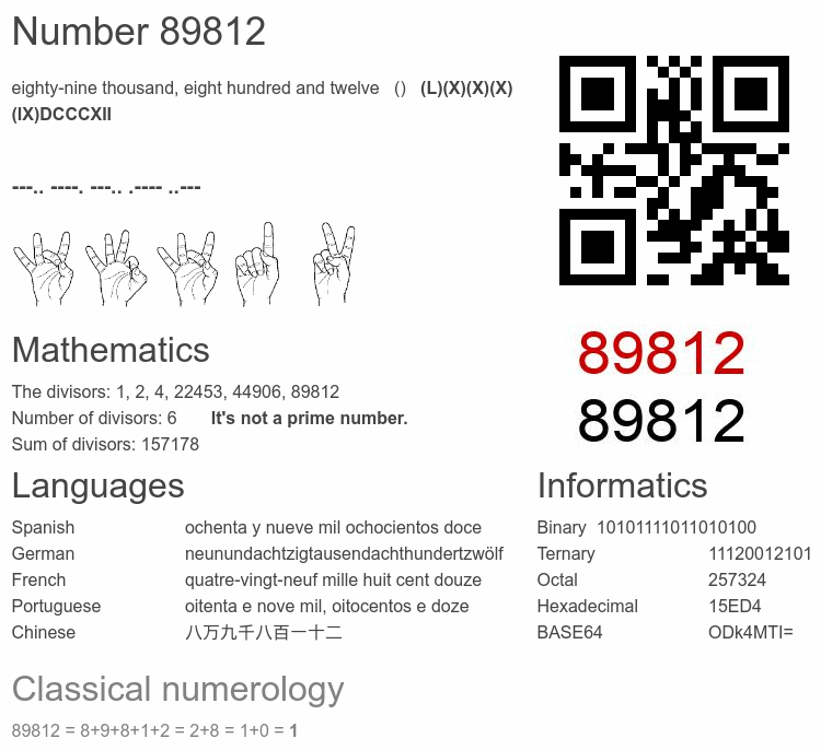 | Japanese: | 🔊 (数 89,812) | 八万九千八百十二 |