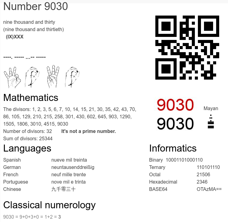 | Arabian: | 🔊 (عدد 9,030) | تسعة آلاف و ثلاثون |