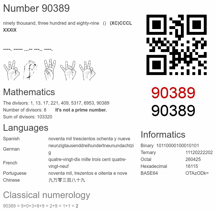 The odd number 90,389 is spelled 🔊, and written in words: ninety thousand, three hundred and eighty-nine. The ordinal number 90389th is said 🔊 and written as: ninety thousand, three hundred and eighty-ninth. The meaning of the number 90389 in Maths: Is it Prime? Factorization and prime factors tree. The square root and cube root of 90389. What is 90389 in computer science, numerology, codes and images, writing and naming in other languages. Other interesting facts related to 90389.