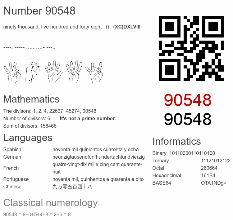 The even number 90,548 is spelled 🔊, and written in words: ninety thousand, five hundred and forty-eight. The ordinal number 90548th is said 🔊 and written as: ninety thousand, five hundred and forty-eighth. The meaning of the number 90548 in Maths: Is it Prime? Factorization and prime factors tree. The square root and cube root of 90548. What is 90548 in computer science, numerology, codes and images, writing and naming in other languages. Other interesting facts related to 90548.