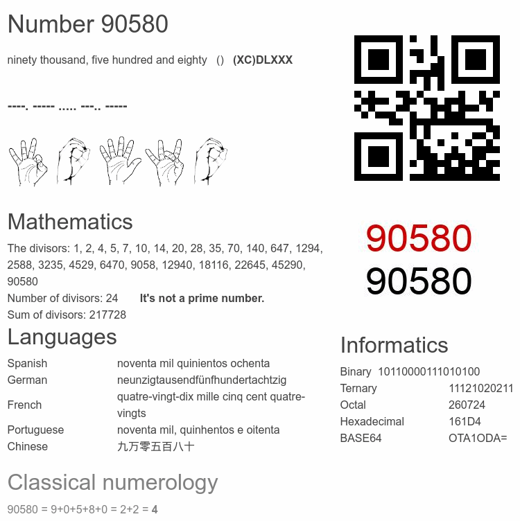 The even number 90,580 is spelled 🔊, and written in words: ninety thousand, five hundred and eighty. The ordinal number 90580th is said 🔊 and written as: ninety thousand, five hundred and eightieth. The meaning of the number 90580 in Maths: Is it Prime? Factorization and prime factors tree. The square root and cube root of 90580. What is 90580 in computer science, numerology, codes and images, writing and naming in other languages. Other interesting facts related to 90580.