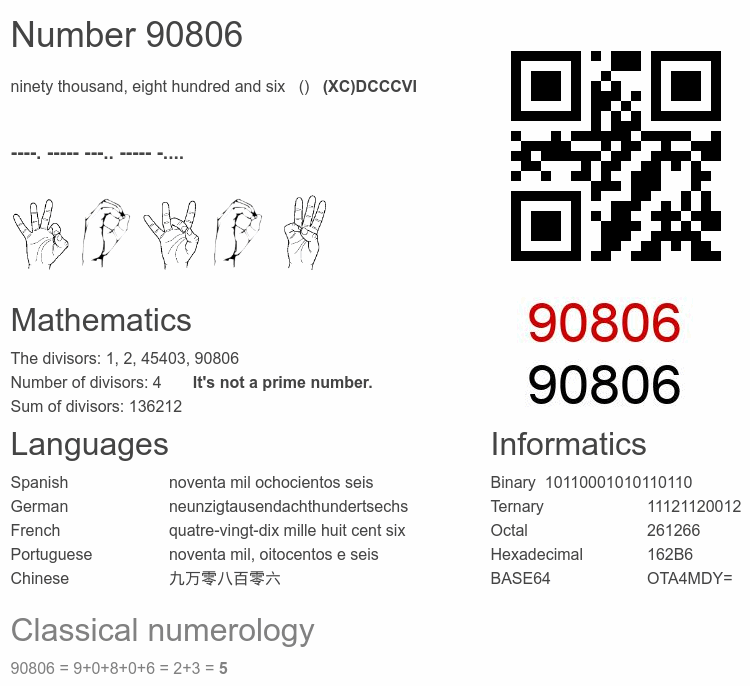 | Portuguese: | 🔊 (número 90 806) | noventa mil, oitocentos e seis |