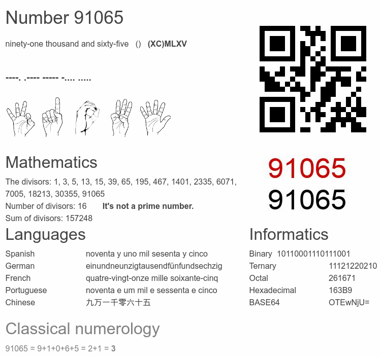 | Chinese: | 🔊 (数 91 065) | 九万一千零六十五 |