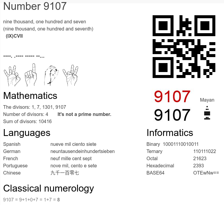 The odd number 9,107 is spelled 🔊, and written in words: nine thousand, one hundred and seven. The ordinal number 9107th is said 🔊 and written as: nine thousand, one hundred and seventh. The meaning of the number 9107 in Maths: Is it Prime? Factorization and prime factors tree. The square root and cube root of 9107. What is 9107 in computer science, numerology, codes and images, writing and naming in other languages. Other interesting facts related to 9107.