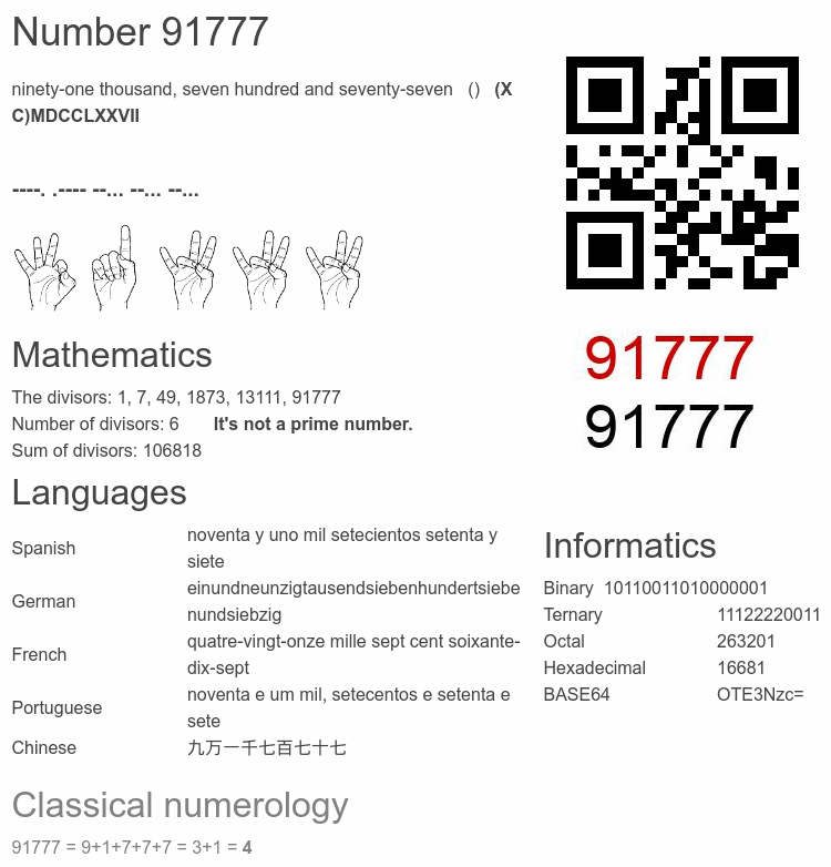 | Chinese: | 🔊 (数 91 777) | 九万一千七百七十七 |