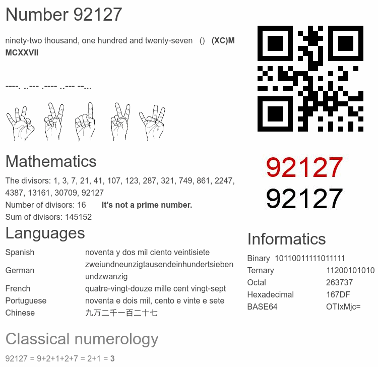 The odd number 92,127 is spelled 🔊, and written in words: ninety-two thousand, one hundred and twenty-seven. The ordinal number 92127th is said 🔊 and written as: ninety-two thousand, one hundred and twenty-seventh. The meaning of the number 92127 in Maths: Is it Prime? Factorization and prime factors tree. The square root and cube root of 92127. What is 92127 in computer science, numerology, codes and images, writing and naming in other languages. Other interesting facts related to 92127.
