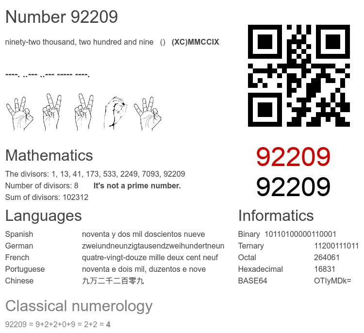 | Chinese: | 🔊 (数 92 209) | 九万二千二百零九 |