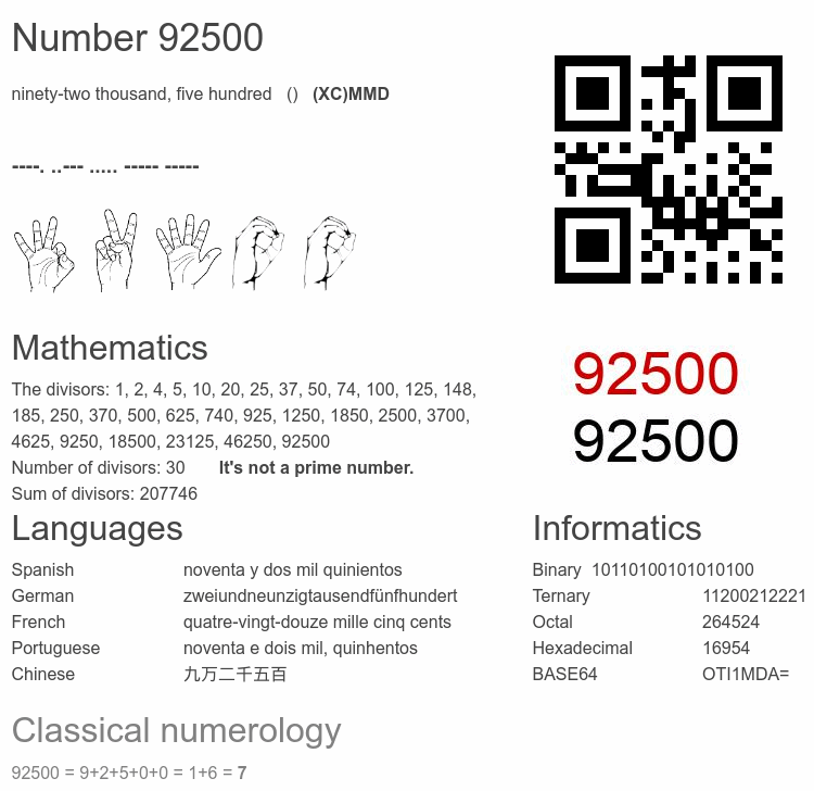 The even number 92,500 is spelled 🔊, and written in words: ninety-two thousand, five hundred. The ordinal number 92500th is said 🔊 and written as: ninety-two thousand, five hundredth. The meaning of the number 92500 in Maths: Is it Prime? Factorization and prime factors tree. The square root and cube root of 92500. What is 92500 in computer science, numerology, codes and images, writing and naming in other languages. Other interesting facts related to 92500.
