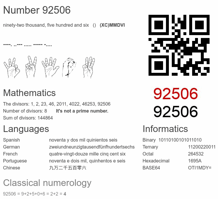 The even number 92,506 is spelled 🔊, and written in words: ninety-two thousand, five hundred and six. The ordinal number 92506th is said 🔊 and written as: ninety-two thousand, five hundred and sixth. The meaning of the number 92506 in Maths: Is it Prime? Factorization and prime factors tree. The square root and cube root of 92506. What is 92506 in computer science, numerology, codes and images, writing and naming in other languages. Other interesting facts related to 92506.