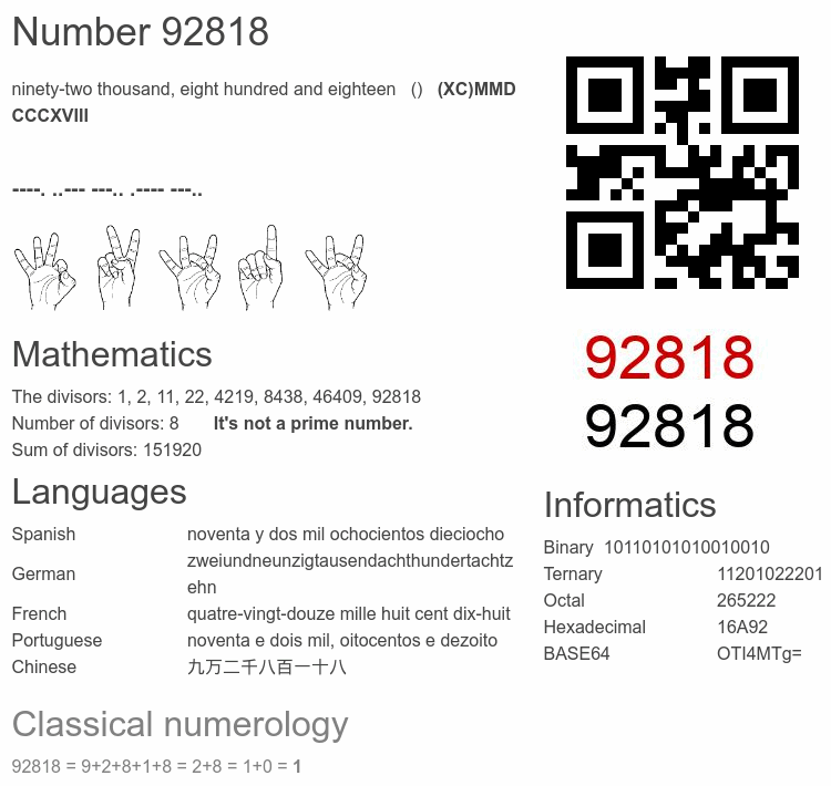 | Portuguese: | 🔊 (número 92 818) | noventa e dois mil, oitocentos e dezoito |