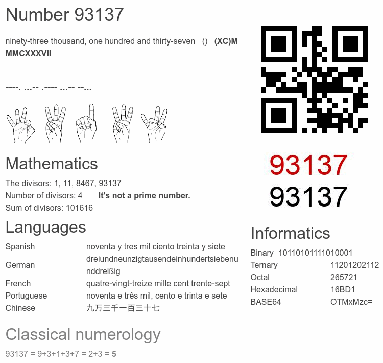 The odd number 93,137 is spelled 🔊, and written in words: ninety-three thousand, one hundred and thirty-seven. The ordinal number 93137th is said 🔊 and written as: ninety-three thousand, one hundred and thirty-seventh. The meaning of the number 93137 in Maths: Is it Prime? Factorization and prime factors tree. The square root and cube root of 93137. What is 93137 in computer science, numerology, codes and images, writing and naming in other languages. Other interesting facts related to 93137.