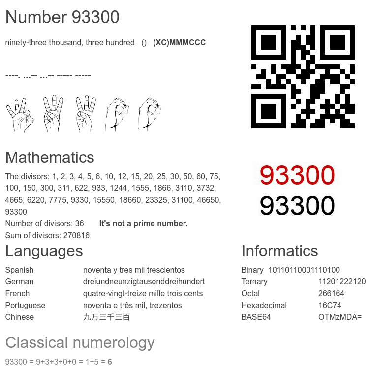 The even number 93,300 is spelled 🔊, and written in words: ninety-three thousand, three hundred. The ordinal number 93300th is said 🔊 and written as: ninety-three thousand, three hundredth. The meaning of the number 93300 in Maths: Is it Prime? Factorization and prime factors tree. The square root and cube root of 93300. What is 93300 in computer science, numerology, codes and images, writing and naming in other languages. Other interesting facts related to 93300.