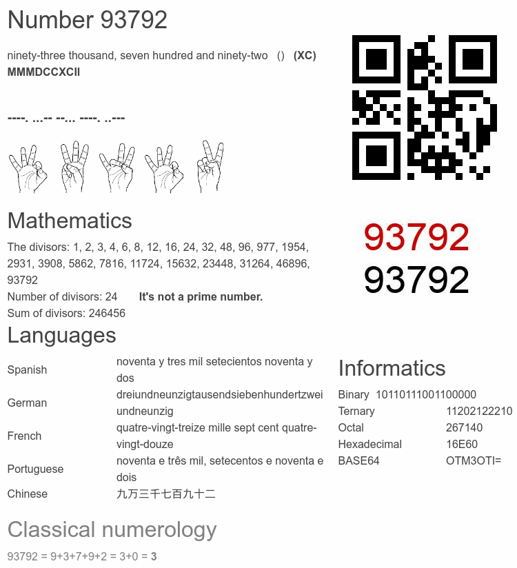 | Arabian: | 🔊 (عدد 93,792) | ثلاثة و تسعون ألفاً و سبعمائةاثنان و تسعون |