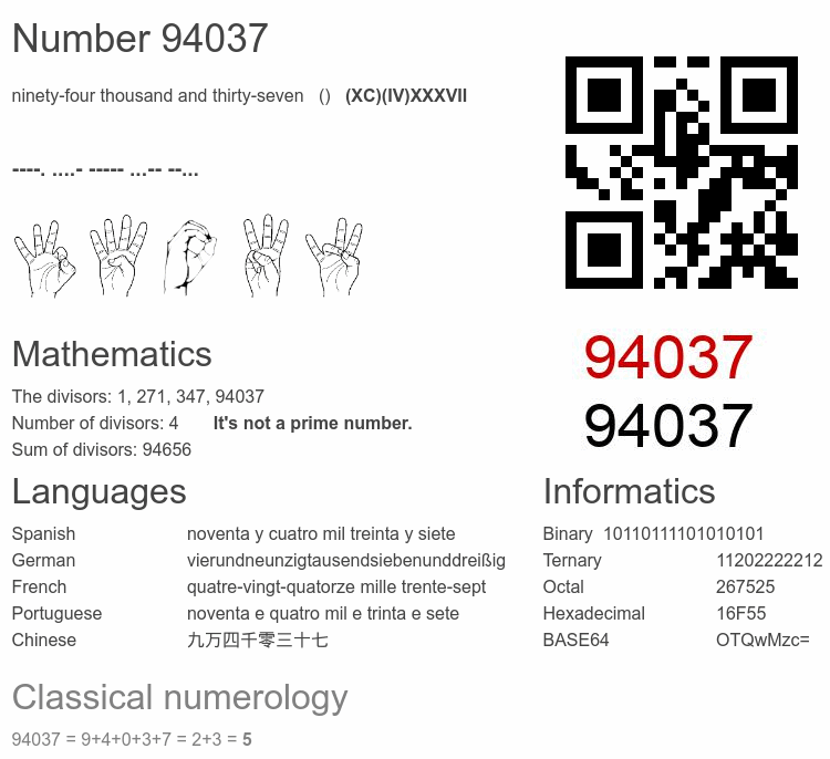 | Spanish: | 🔊 (número 94.037) | noventa y cuatro mil treinta y siete |