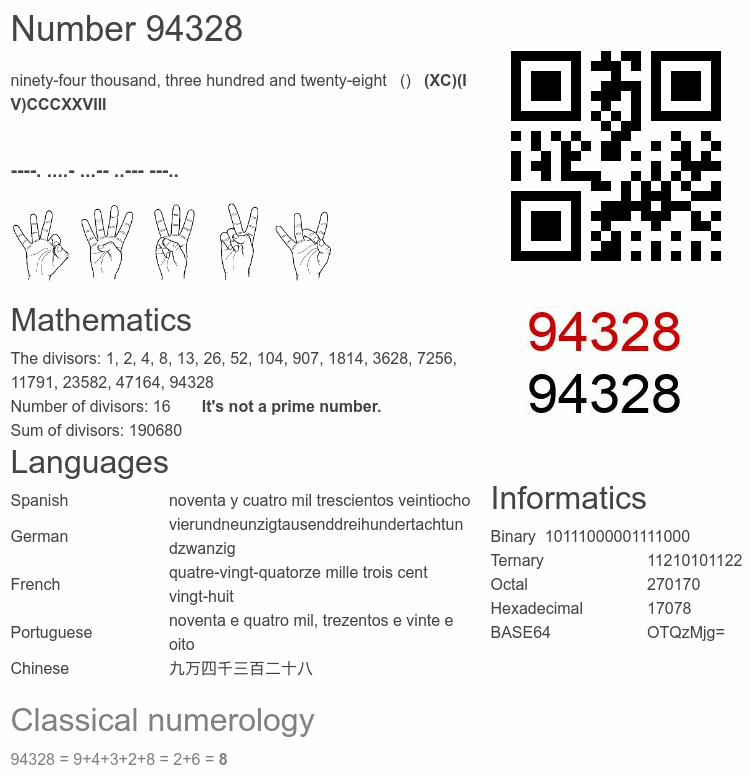 The even number 94,328 is spelled 🔊, and written in words: ninety-four thousand, three hundred and twenty-eight. The ordinal number 94328th is said 🔊 and written as: ninety-four thousand, three hundred and twenty-eighth. The meaning of the number 94328 in Maths: Is it Prime? Factorization and prime factors tree. The square root and cube root of 94328. What is 94328 in computer science, numerology, codes and images, writing and naming in other languages. Other interesting facts related to 94328.