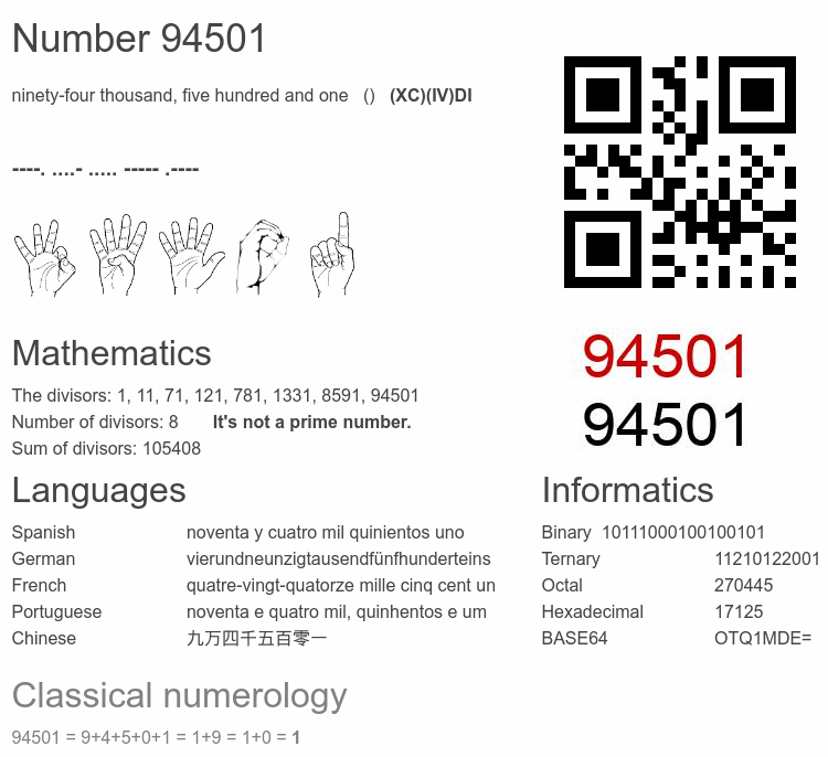 | Arabian: | 🔊 (عدد 94,501) | أربعة و تسعون ألفاً و خمسمائة و واحد |