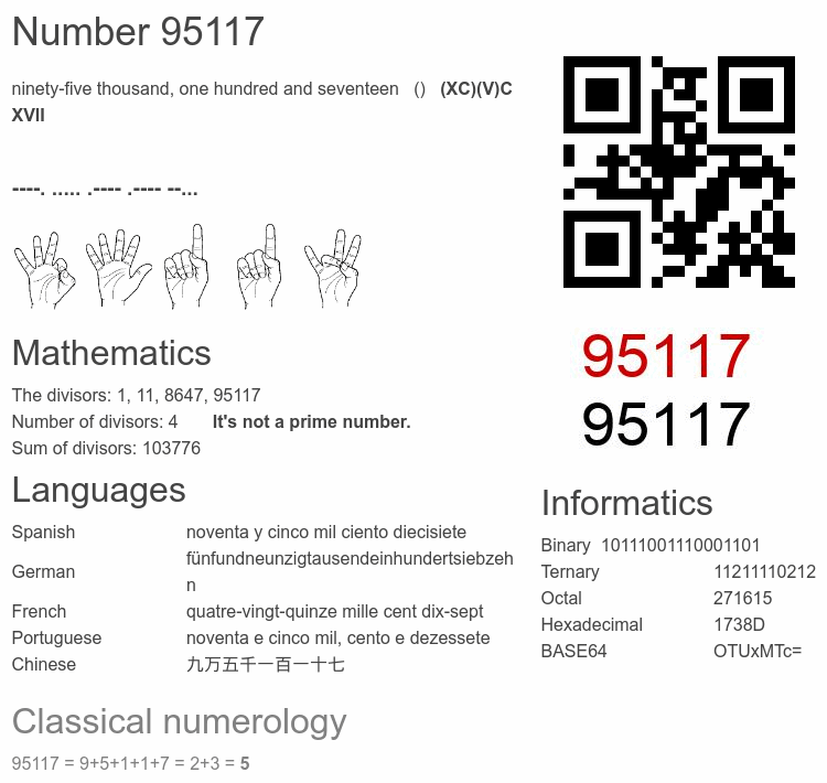 | Portuguese: | 🔊 (número 95 117) | noventa e cinco mil, cento e dezessete |