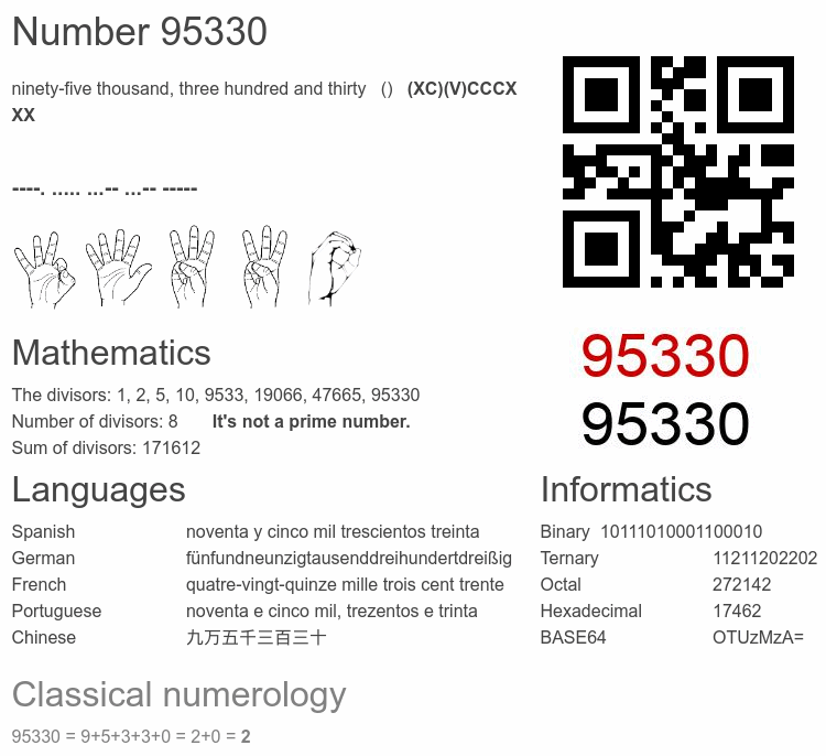 The even number 95,330 is spelled 🔊, and written in words: ninety-five thousand, three hundred and thirty. The ordinal number 95330th is said 🔊 and written as: ninety-five thousand, three hundred and thirtieth. The meaning of the number 95330 in Maths: Is it Prime? Factorization and prime factors tree. The square root and cube root of 95330. What is 95330 in computer science, numerology, codes and images, writing and naming in other languages. Other interesting facts related to 95330.