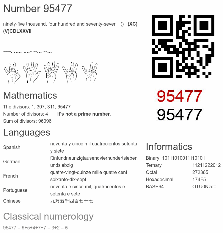 | Spanish: | 🔊 (número 95.477) | noventa y cinco mil cuatrocientos setenta y siete |