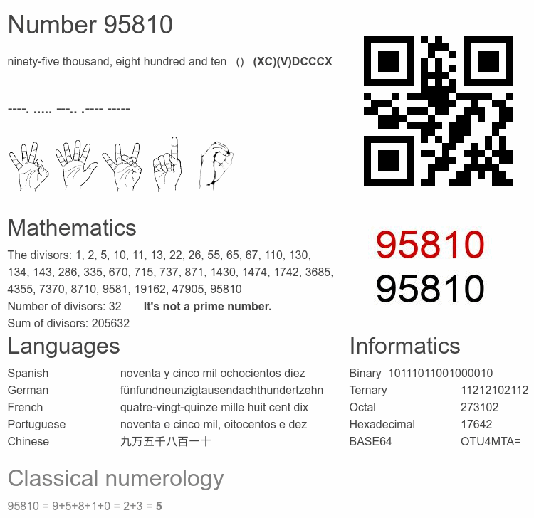 | Arabian: | 🔊 (عدد 95,810) | خمسة و تسعون ألفاً و ثمانمائة و عشرة |