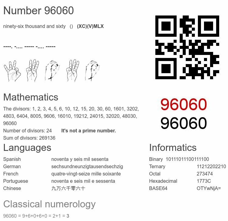 | Spanish: | 🔊 (número 96.060) | noventa y seis mil sesenta |
