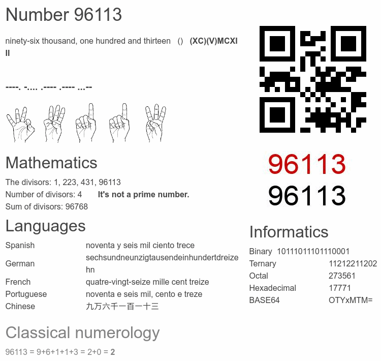 | French: | 🔊 (nombre 96 113) | quatre-vingt-seize mille cent treize |