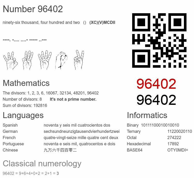 The even number 96,402 is spelled 🔊, and written in words: ninety-six thousand, four hundred and two. The ordinal number 96402nd is said 🔊 and written as: ninety-six thousand, four hundred and second. The meaning of the number 96402 in Maths: Is it Prime? Factorization and prime factors tree. The square root and cube root of 96402. What is 96402 in computer science, numerology, codes and images, writing and naming in other languages. Other interesting facts related to 96402.