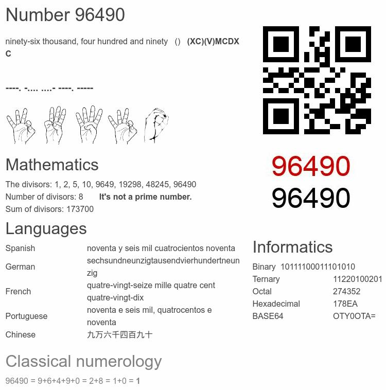 | Spanish: | 🔊 (número 96.490) | noventa y seis mil cuatrocientos noventa |