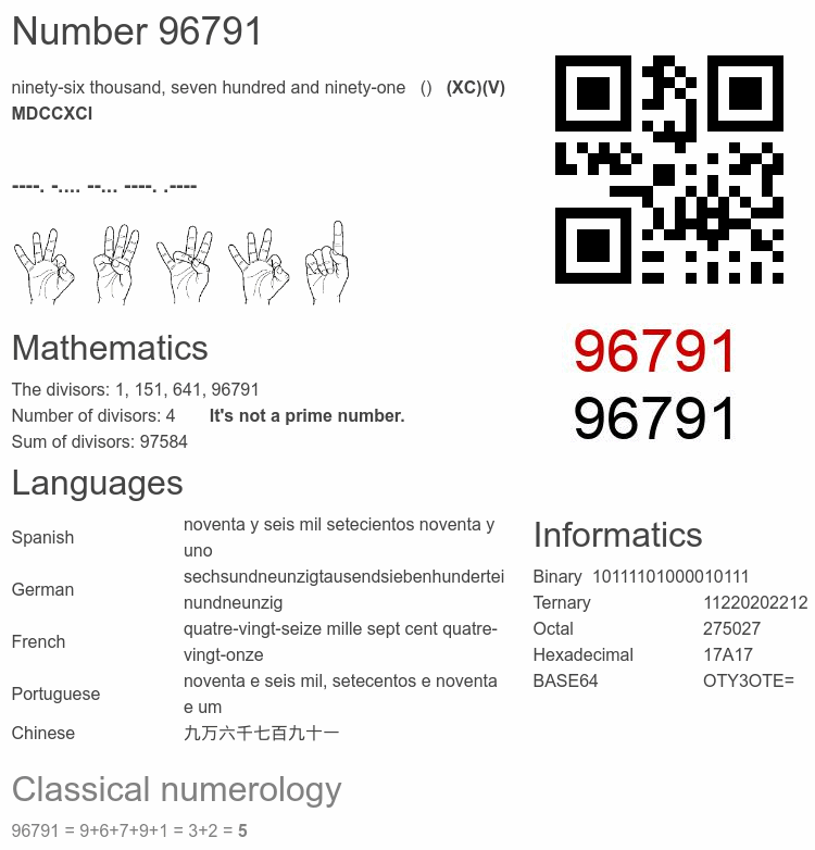 If you know something interesting about the number 96791 or any natural number (positive integer), please write to us.What is 96,791 in other units