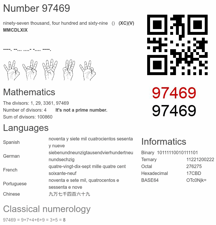 If you know something interesting about the number 97469 or any natural number (positive integer), please write to us.What is 97,469 in other units