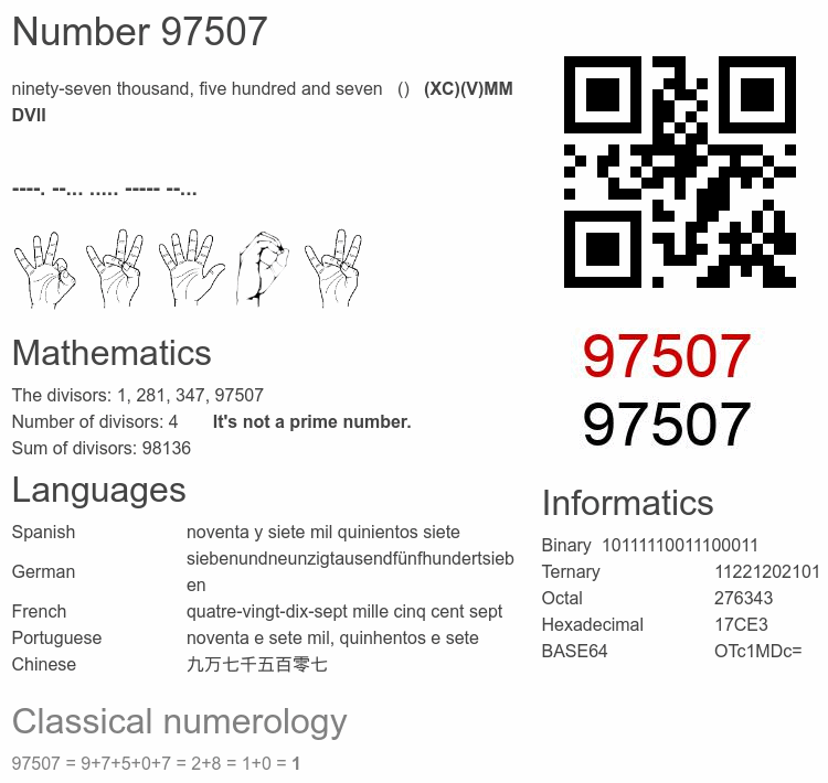 | Spanish: | 🔊 (número 97.507) | noventa y siete mil quinientos siete |