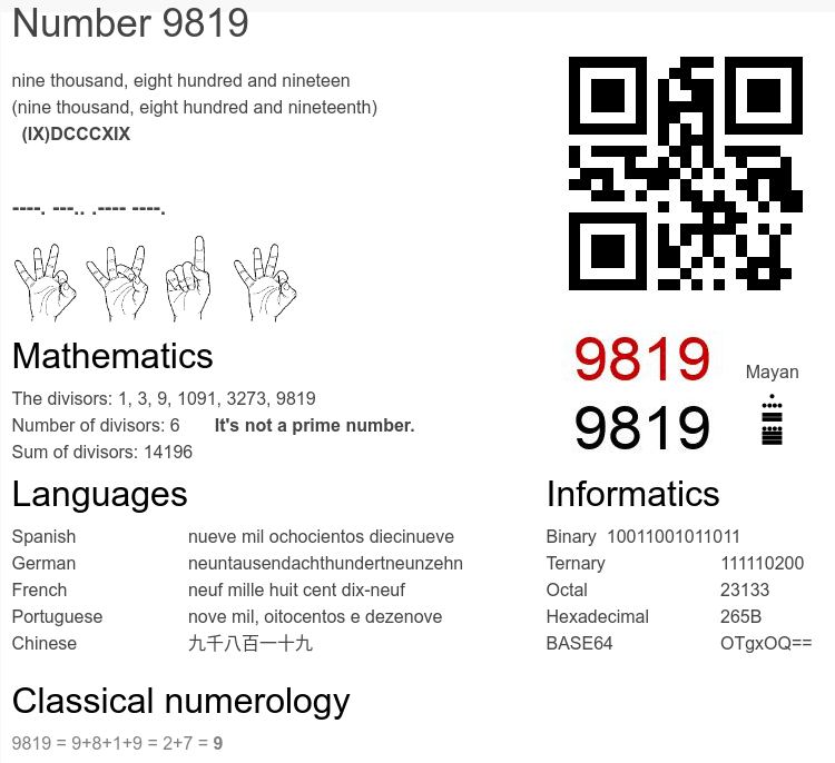 If you know something interesting about the number 9819 or any natural number (positive integer), please write to us.What is 9,819 in other units