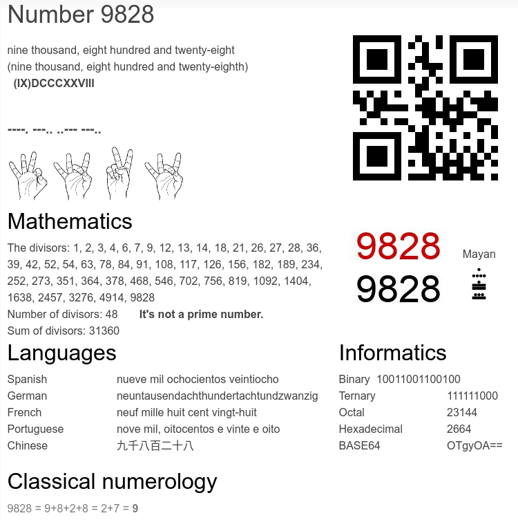 If you know something interesting about the number 9828 or any natural number (positive integer), please write to us.What is 9,828 in other units