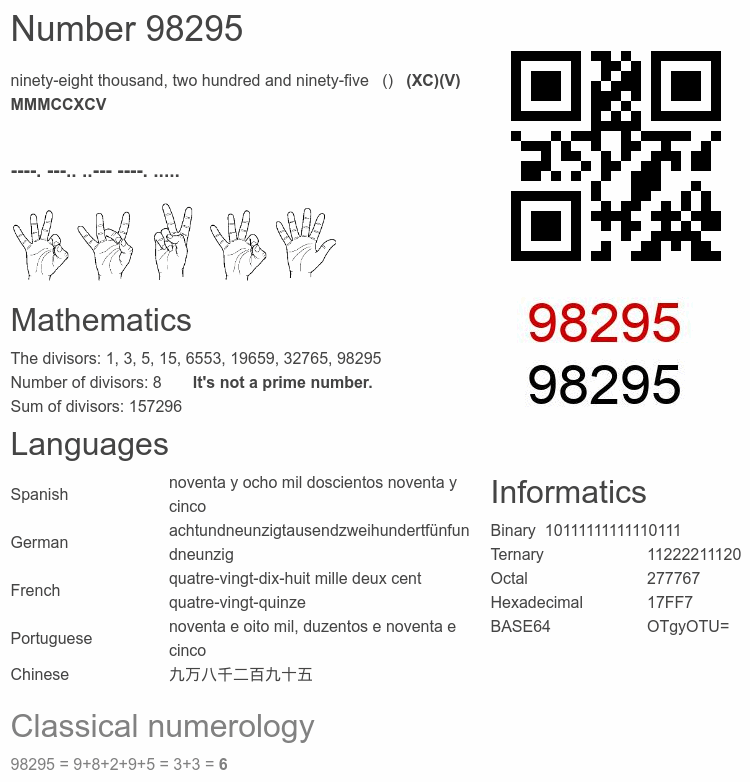 The odd number 98,295 is spelled 🔊, and written in words: ninety-eight thousand, two hundred and ninety-five. The ordinal number 98295th is said 🔊 and written as: ninety-eight thousand, two hundred and ninety-fifth. The meaning of the number 98295 in Maths: Is it Prime? Factorization and prime factors tree. The square root and cube root of 98295. What is 98295 in computer science, numerology, codes and images, writing and naming in other languages. Other interesting facts related to 98295.