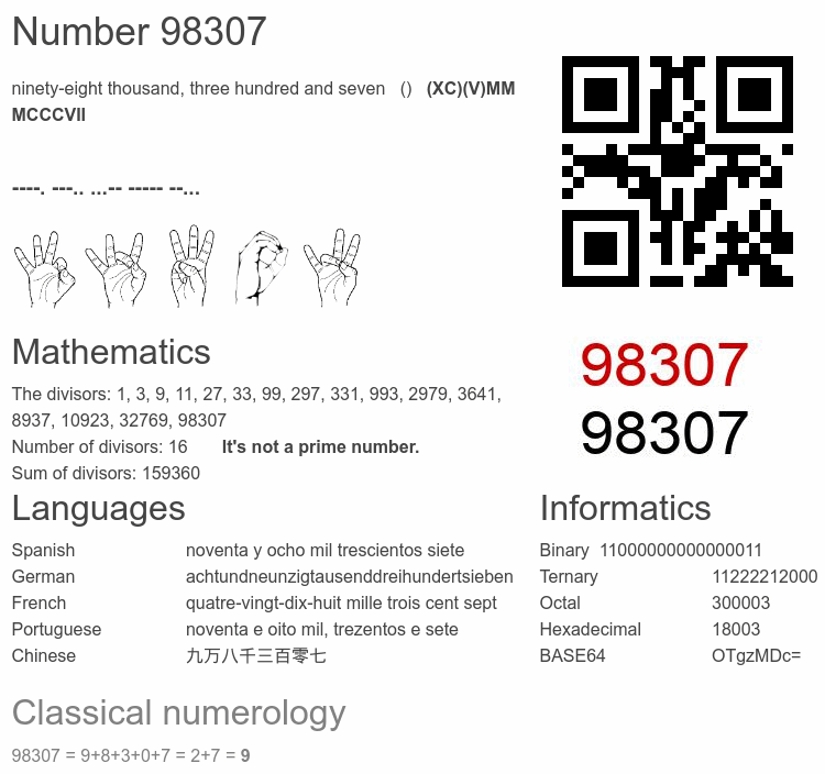 | Arabian: | 🔊 (عدد 98,307) | ثمانية و تسعون ألفاً و ثلاثمائة و سبعة |