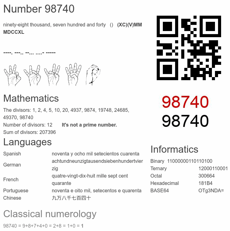 | Italian: | 🔊 (numero 98 740) | novantottomilasettecentoquaranta |