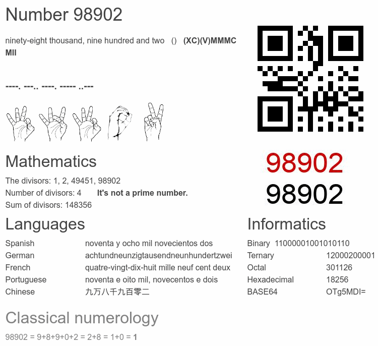 | Spanish: | 🔊 (número 98.902) | noventa y ocho mil novecientos dos |